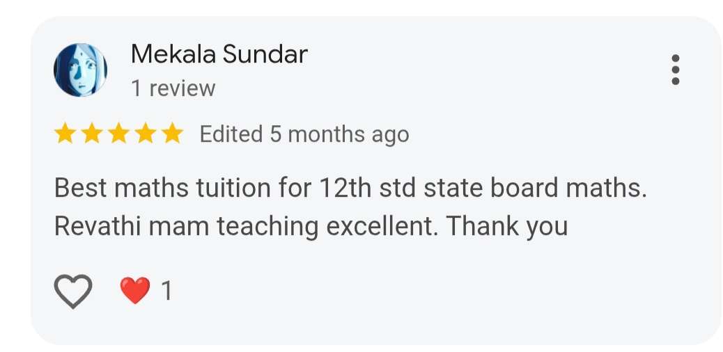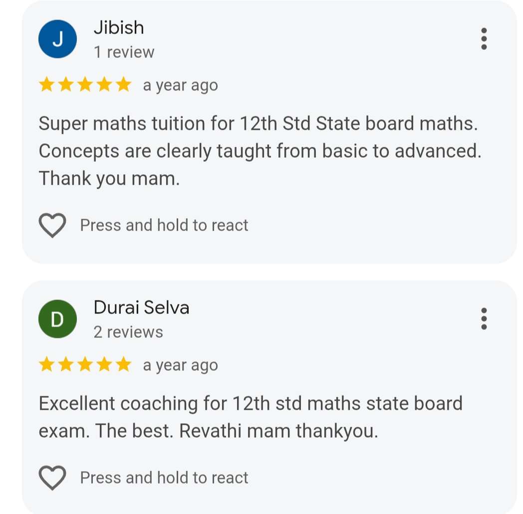 Study and get trained with Revathi Mam in our live online class and interact with peers, clear your doubts instantly and and build confidence to score full marks in 12th std State board exam in math’s.